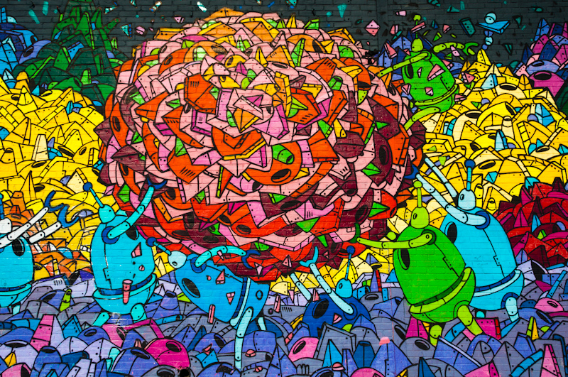 | You can find this mural in Williamsburg, Brooklyn. This mural is a little bit bigger than you see here, but I wasn't able to get it all in one photo. Here you can see a photo of the complete mural. (photographed by Joanna_Pan) As you can see it is very colorful and has a lot of detail, it must have been some job! The name of the artist is R. Nicholas Kuszyk. For more murals go to Oakland Daily Photo |